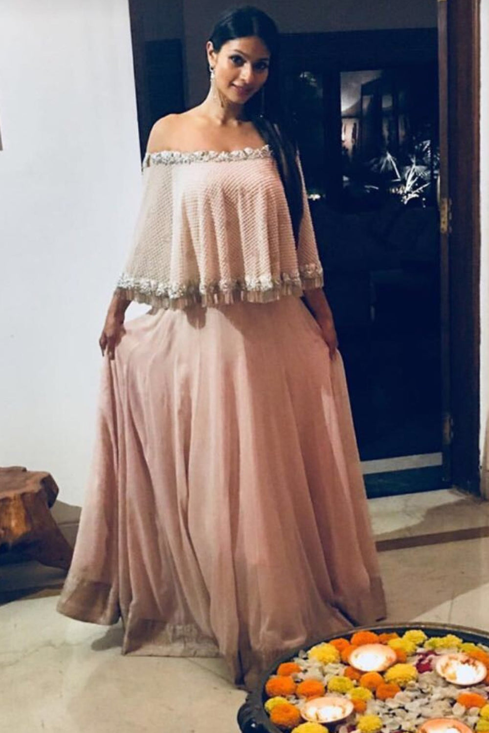 Actress Tanisha Mukherjee in our pight pink one shoulder cape with silver work paired with a light pink flowy georgette anarkali.