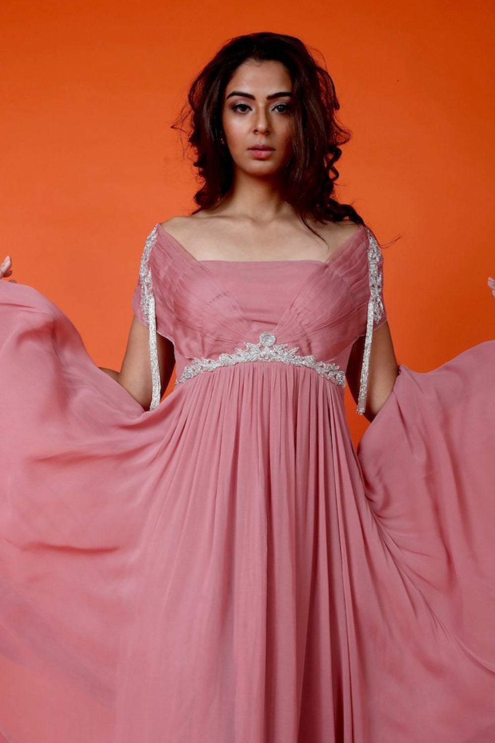 Onion pink off shoulder pleated detail anarkali. It has an embroidered zardosi work silver belt on empire line.