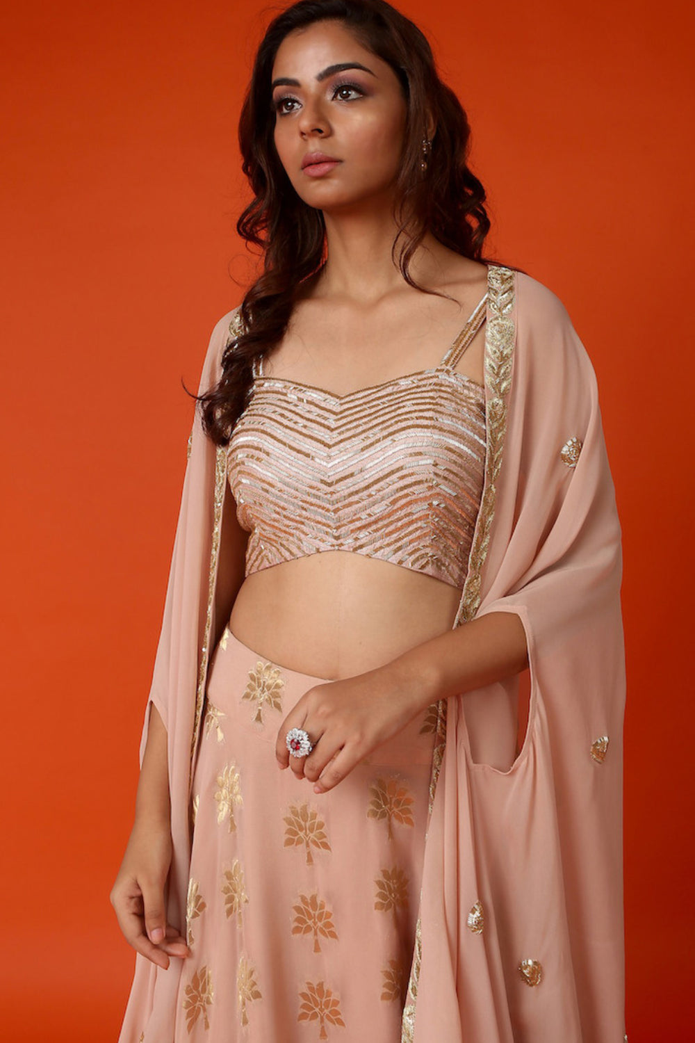 This beige gold banarasi lehenga set come with a banarasi georgette skirt with raw silk gold tube embroidery and a embroidered cape.