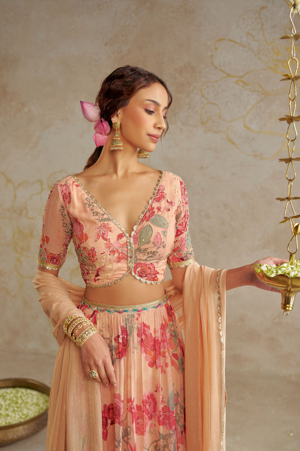 Featuring a beige printed lehenga in georgette. It is paired with an intricately hand-embroidered blouse and dupatta in lurex georgette.