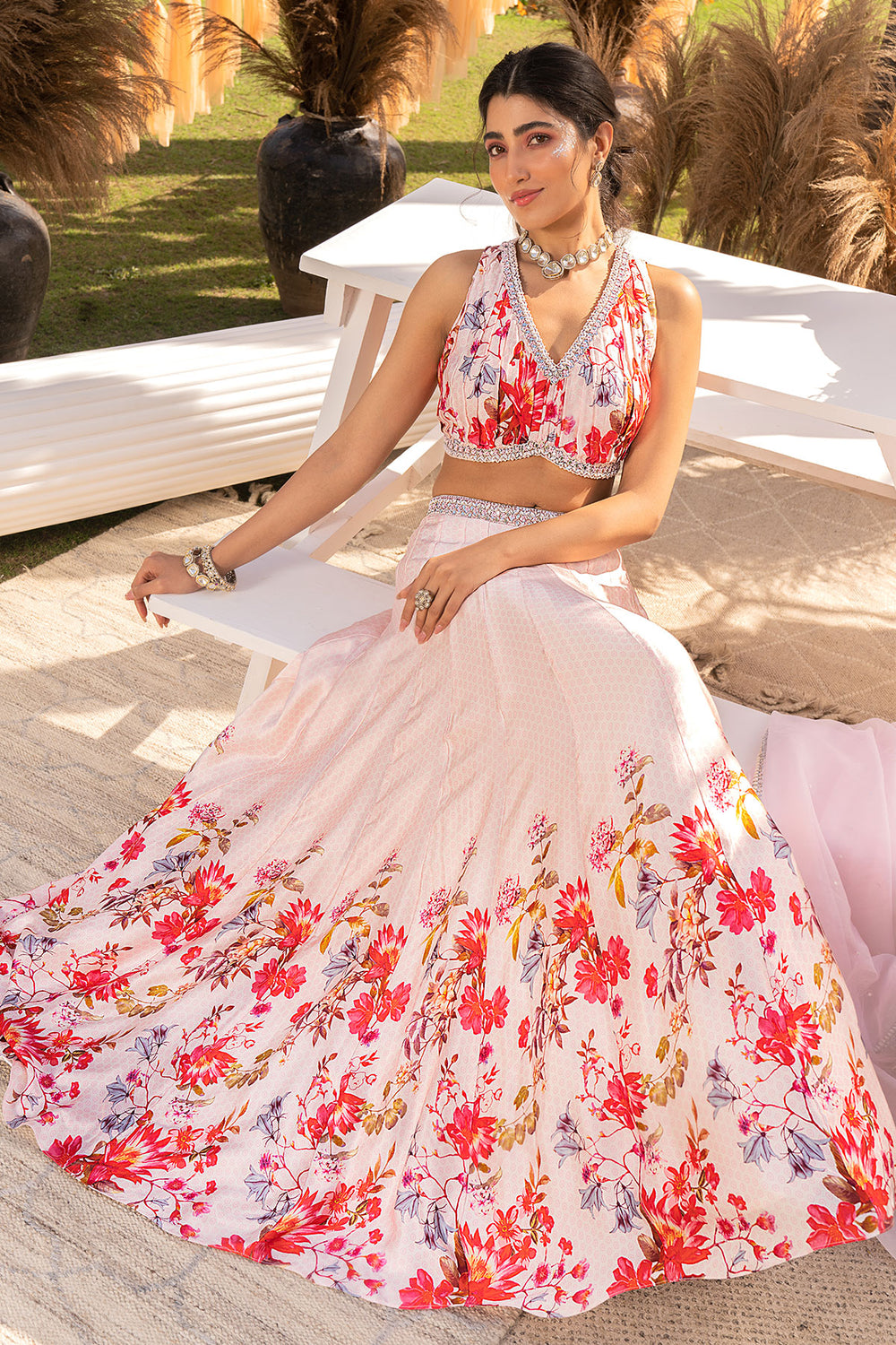 Featuring Here a off white printed lehenga. This set has an embroidered blouse and dupatta