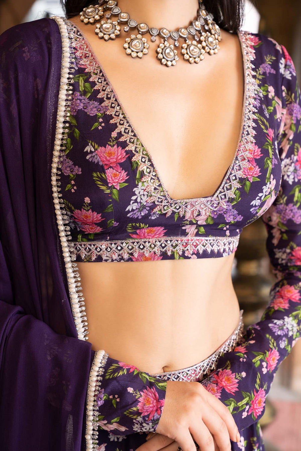 Featuring Here A Purple Floral printed Lehenga set With Embroidered Waist Band. This set comes with a full sleeve printed blouse with embroidered neckline and a georgette dupatta.