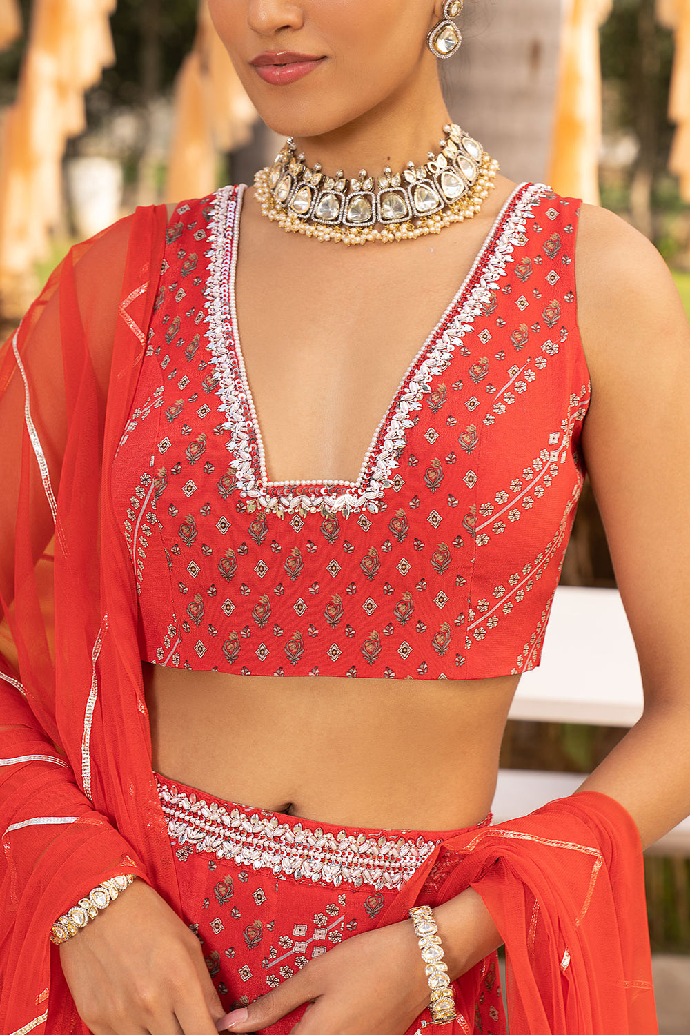 Featuring here a red bootie and stripe printed lehenga set. It has an embroidered blouse and a soft net dupatta