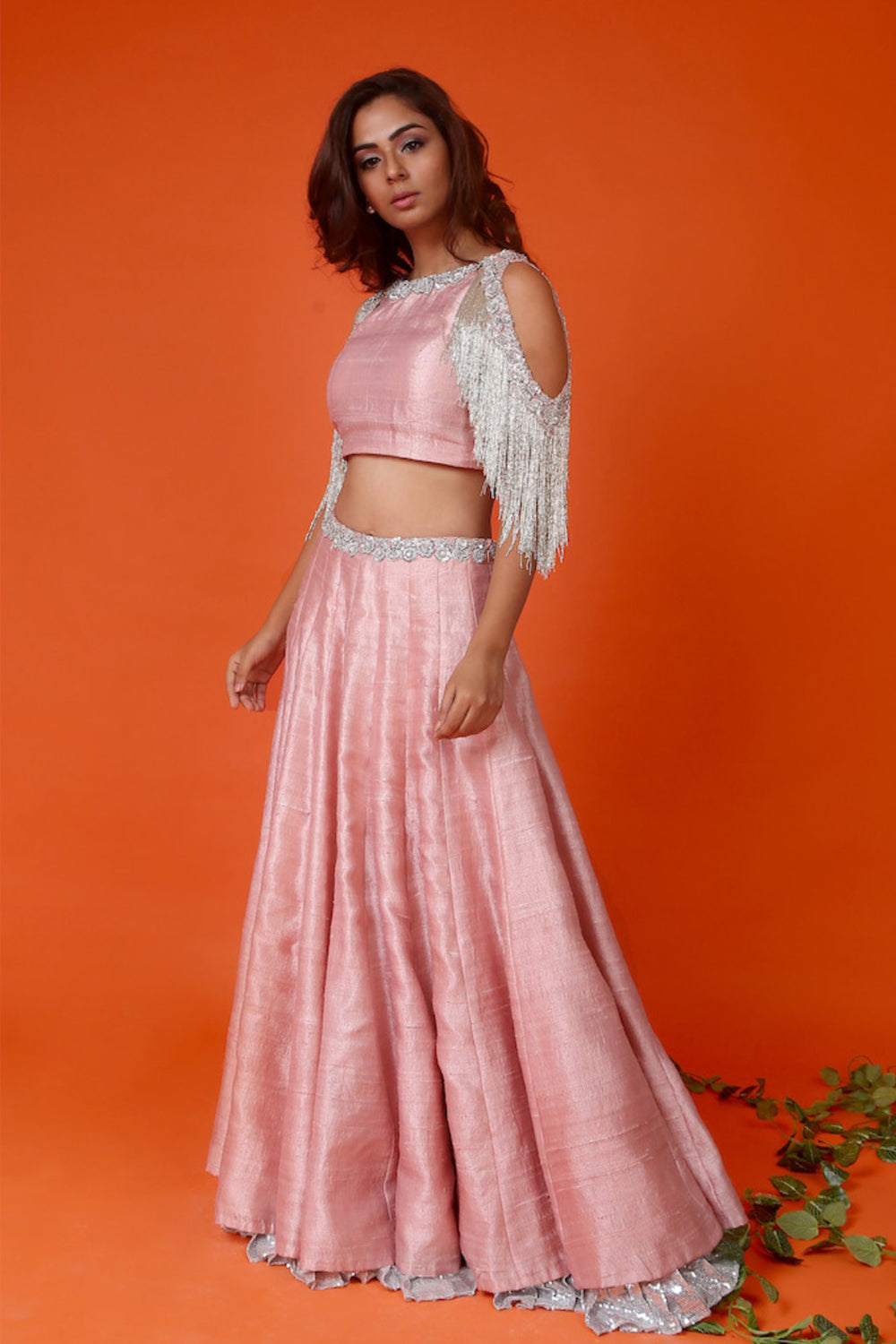 Rose Pink Cold Shoulder Blouse With Lehenga Skirt
