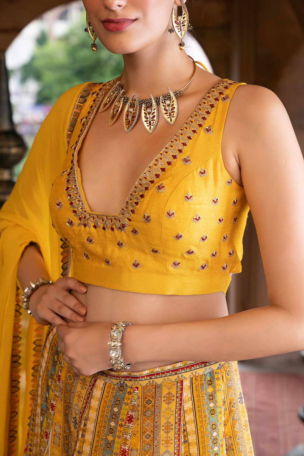 Featuring Here a yellow printed lehenga. It is paired with a raw silk embroidered blouse and georgette dupatta