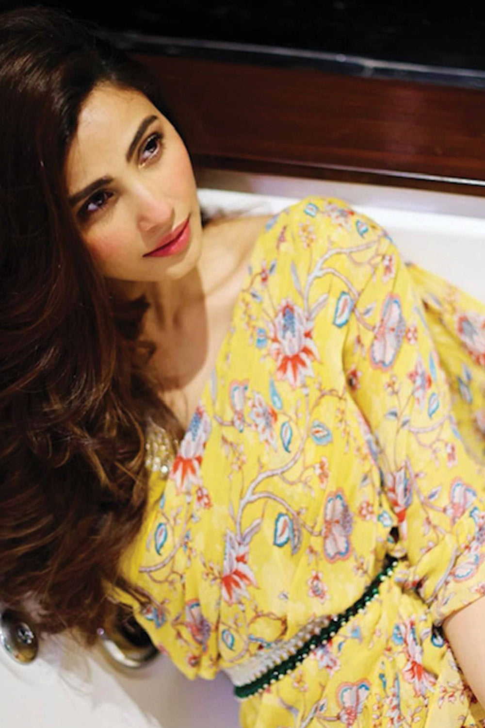 Featuring here actress daisy shah in our georgette printed frill saree with hand embroidered yellow blouse. This set comes with an embroidered yellow and silver belt.