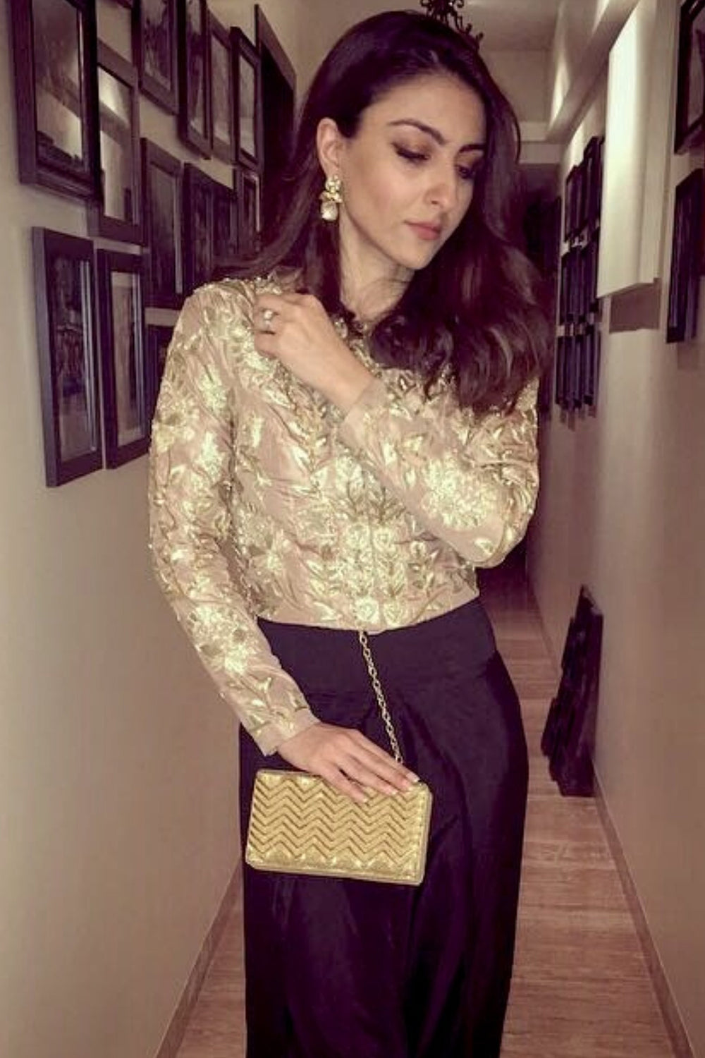 Actress Soha Ali Khan in our silk embeoidered jacket with dhoti pants