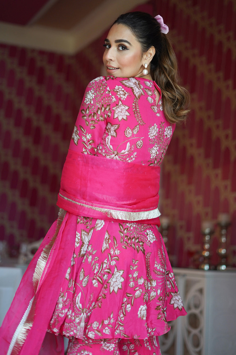 In fluencer Summiya from house of misu in our pink sharara set. This set has an embroidred dupatta and neckline