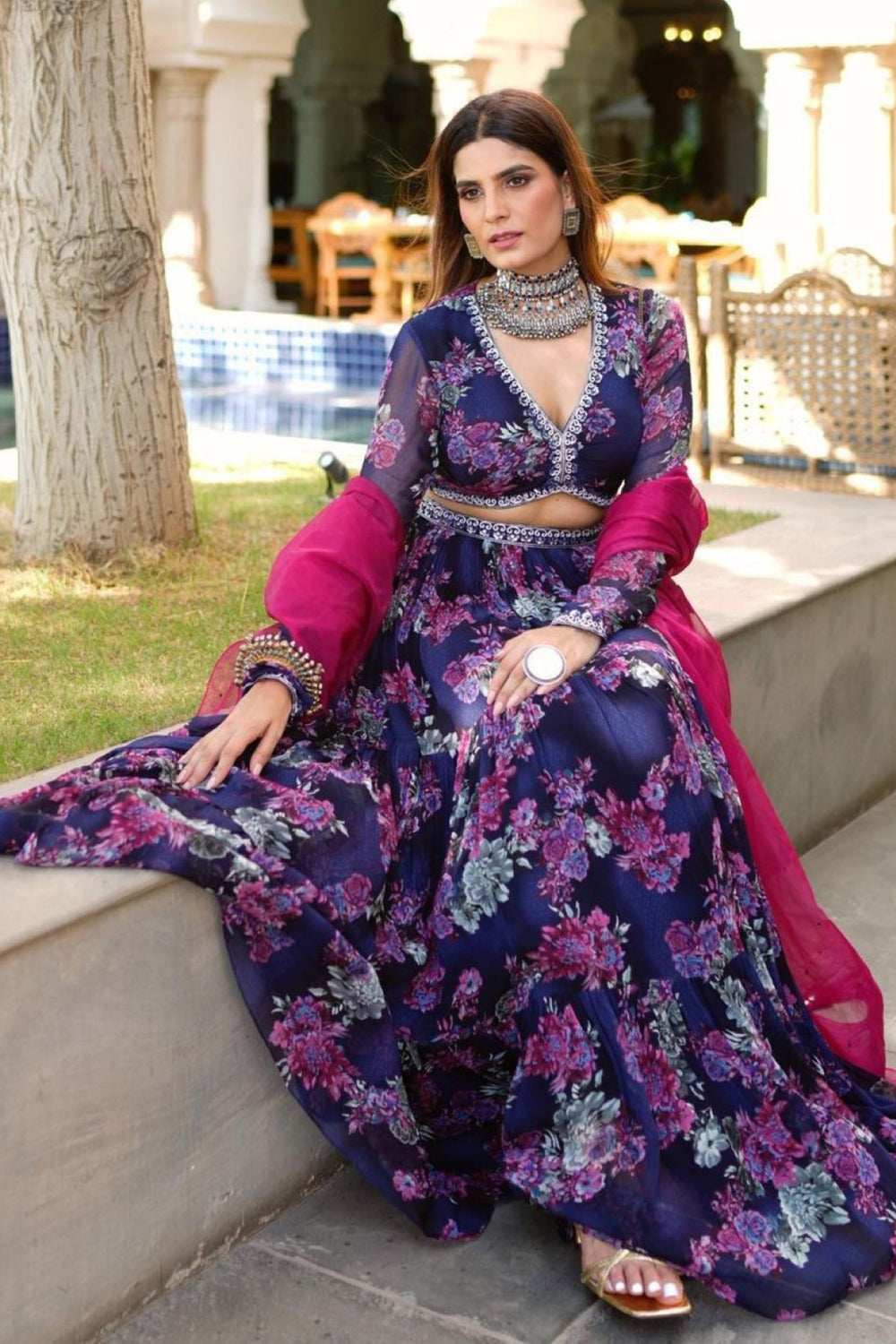 Influencer Krishna in our navy printed lehenga set. This set has an embroidered dupatta and printed blouse