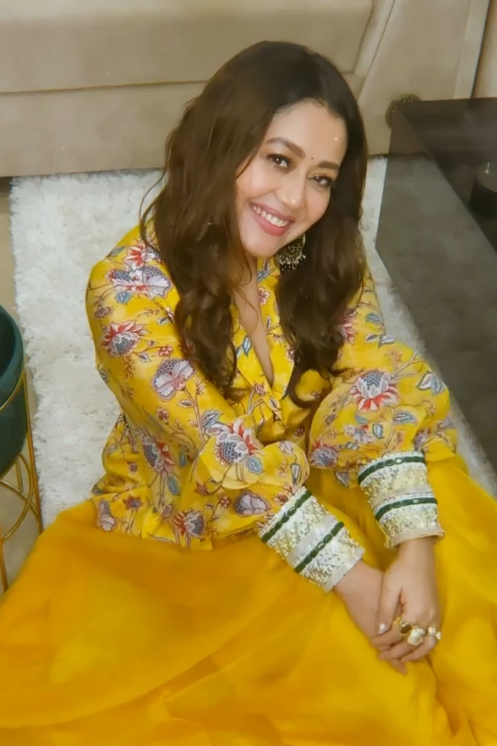 Featuring here singer neha kakkar in our yellow printed jacket with balloon sleeves and hand embroidered cuffs. It comes with yellow organza palazzo and hand embroidered belt.