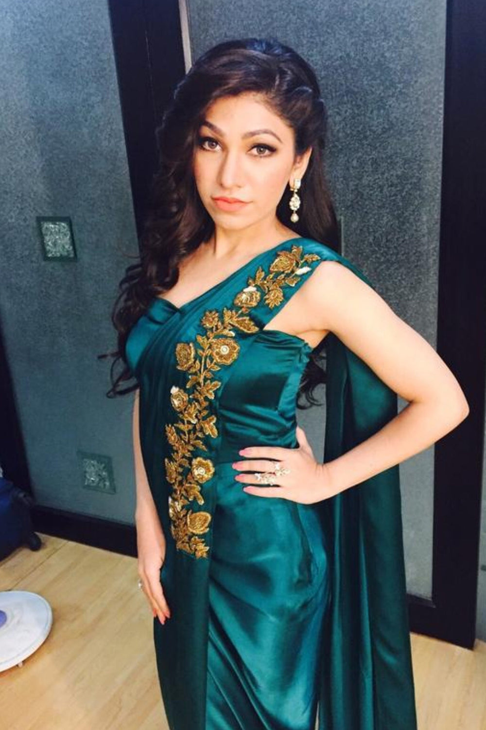 Actress Tulsi Kumar in our Green off shoulder drape saree in satin base with floral embroidery on the front. This set has a churidaar