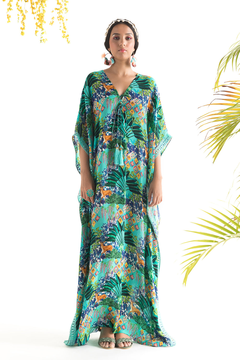 Featuring Here aqua blue jungle printed kaftan with neckline dori