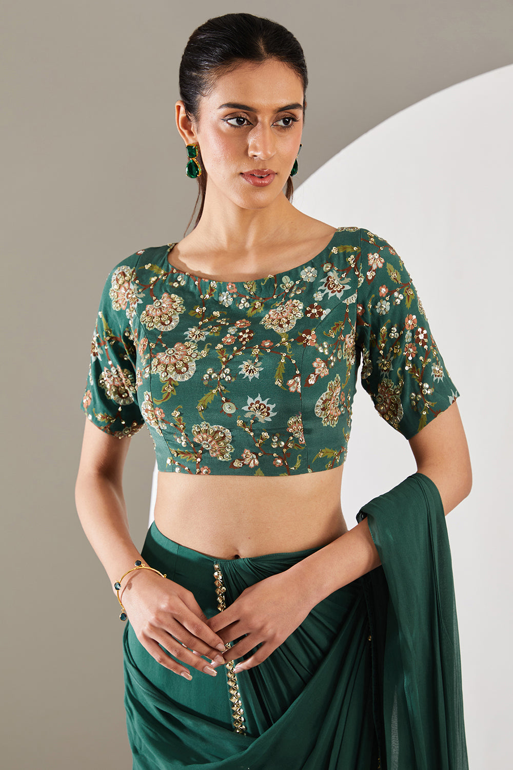 Featuring here green Pre-draped Saree. This Comes Printed Blouse With Hand Embroidery On The Blouse and saree.