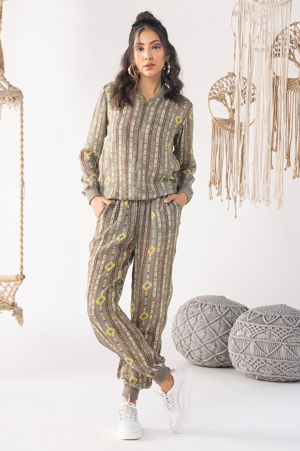 Featuring Here a grey printed jacket with front zip details , it comes with matching printed joggers