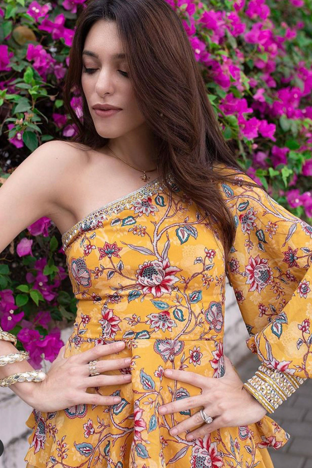 Influencer Maia Sethna in our yellow printed one shoulder peplum top with organza palazzo. This set has an embroidered cuffs