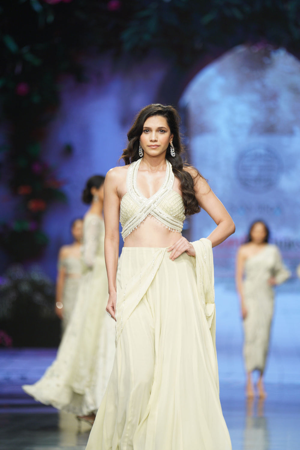Featuring an ivory pre-draped saree with an embroidered halter neck blouse.