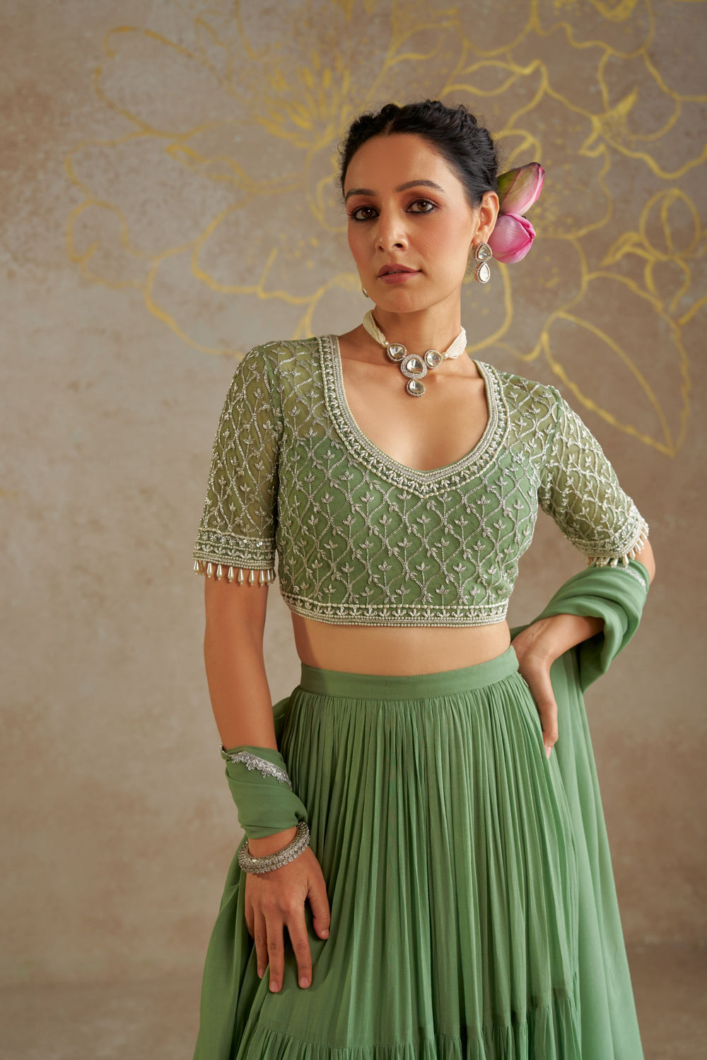 Featuring a sage green tiered lehenga in georgette. It is paired with a hand-embroidered blouse and a georgette dupatta.