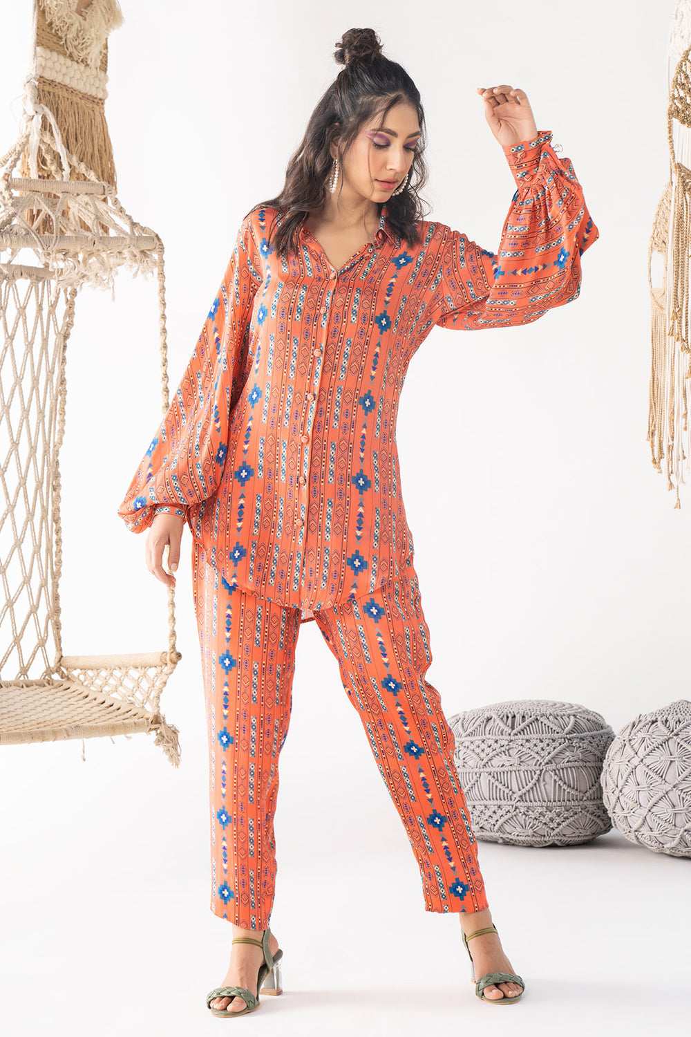 Featuring Here a orange printed balloon sleeve shirt with pants