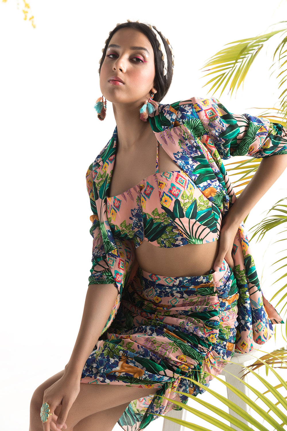 Featuring here a pink jungle printed three piece co-ord set.