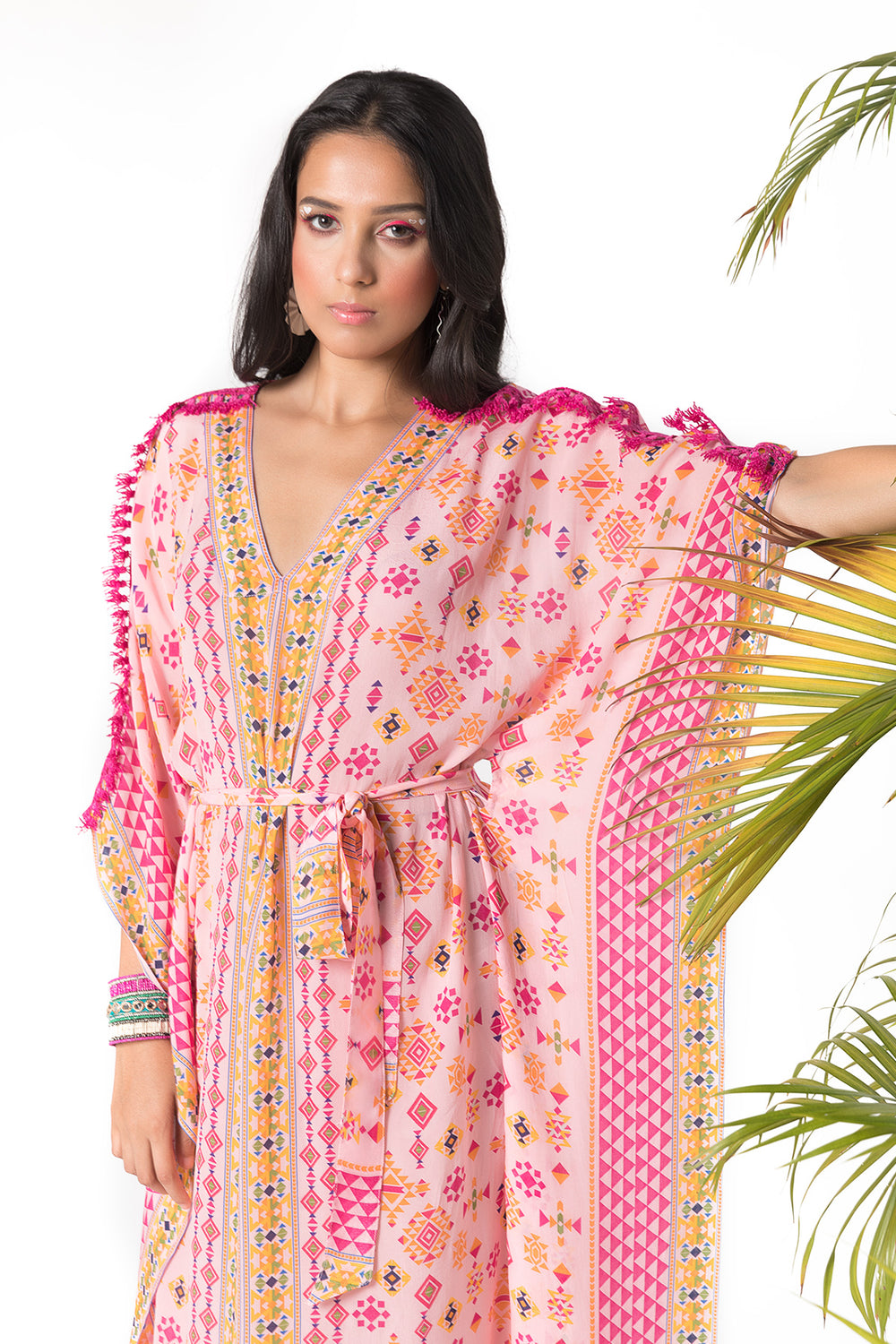 Featuring Here a pink printed kaftan with a belt