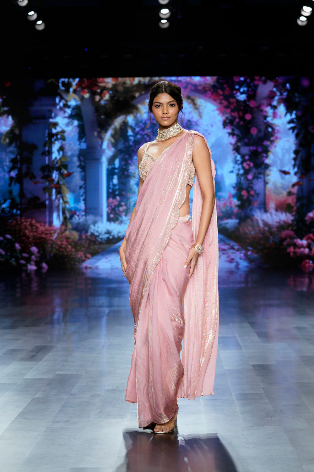 Featuring a pink tissue saree with hand-embroidered blouse and pallu.