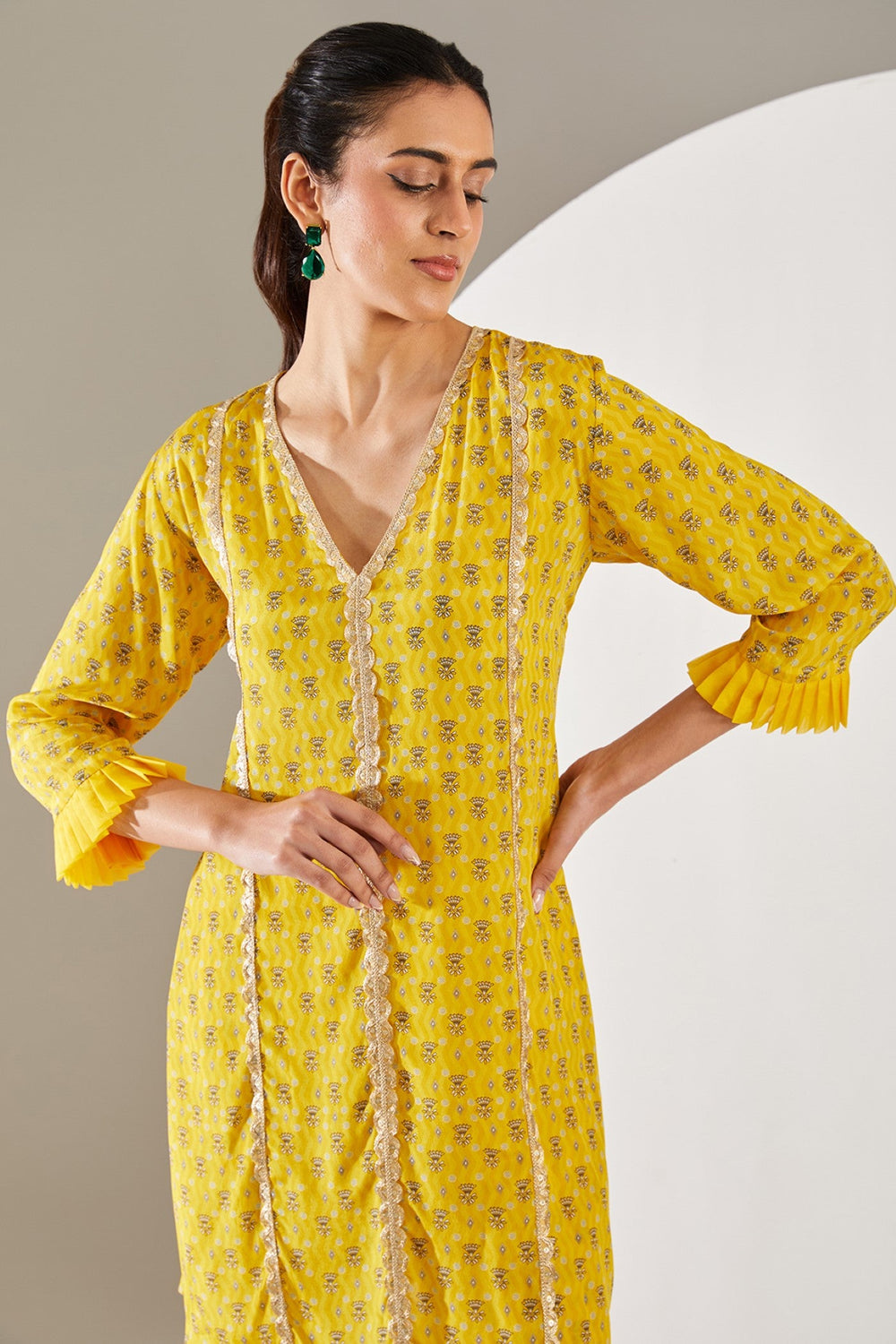 Featuring a yellow printed kurta with pants