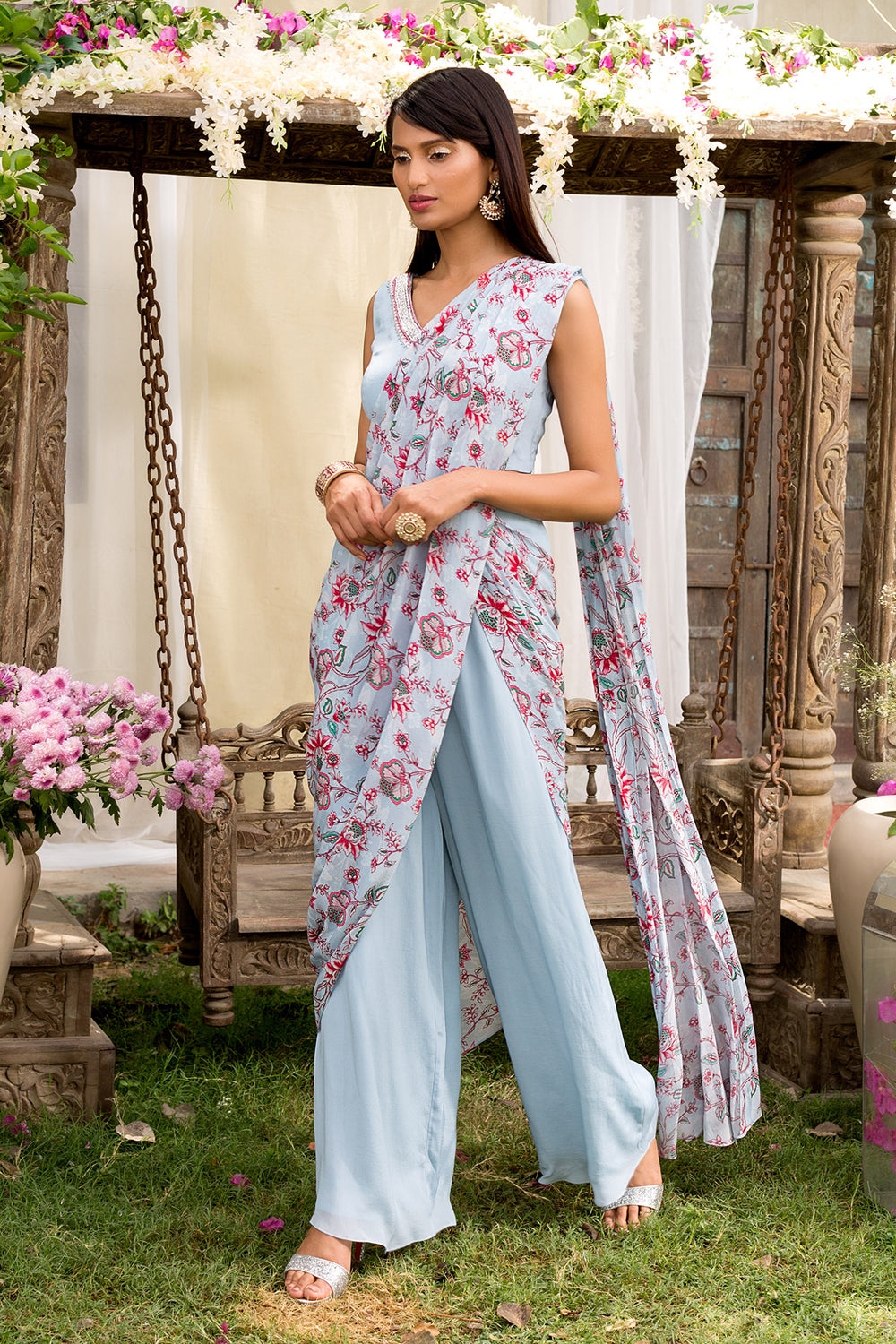 Featuring here powder blue sleeveless blouse with hand embroidered neckline. This set has powder blue crepe pants with attached printed drape to be worn like a pant saree