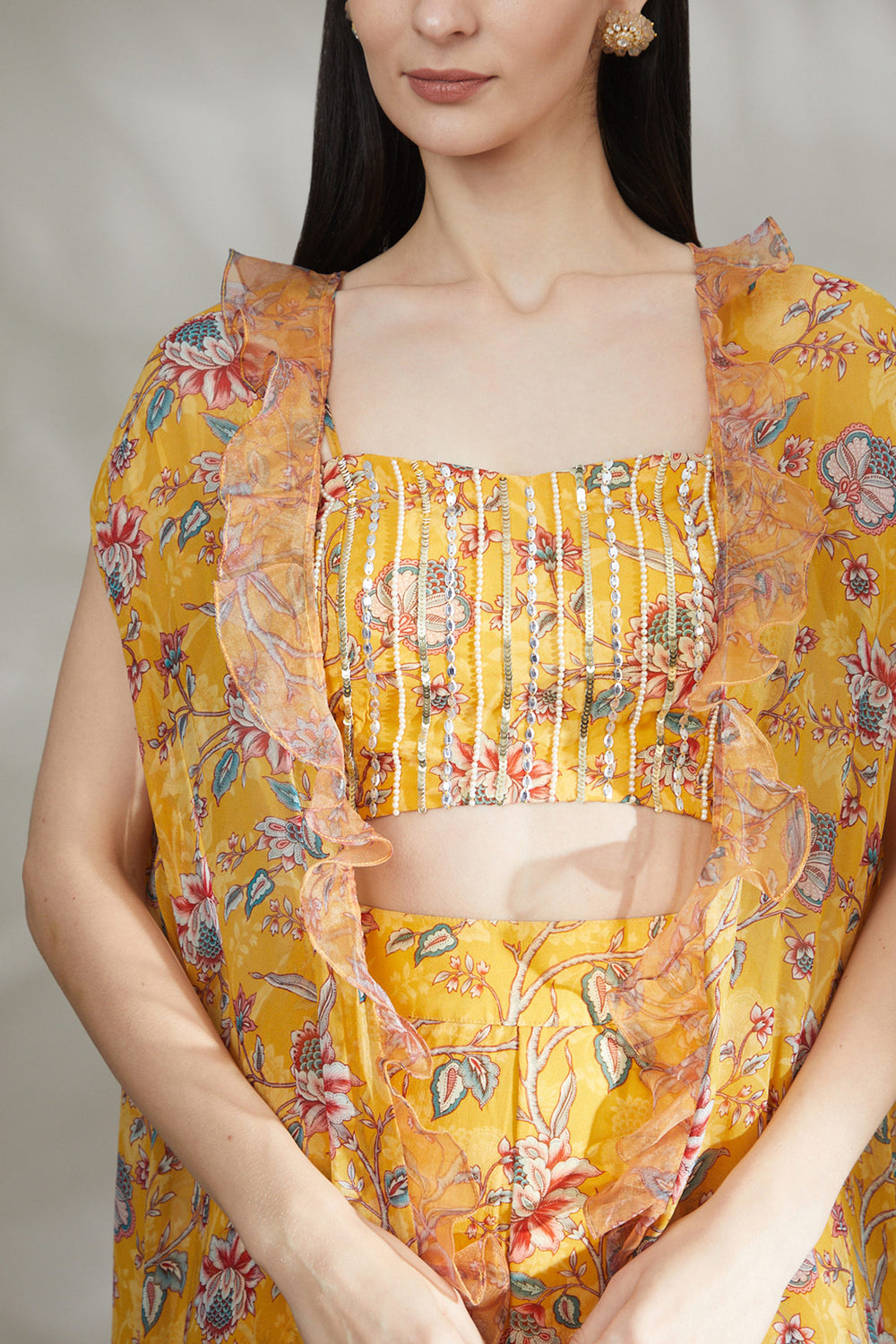 Featuring here a palazzo set in georgette. This has an embroidered inner and cape.