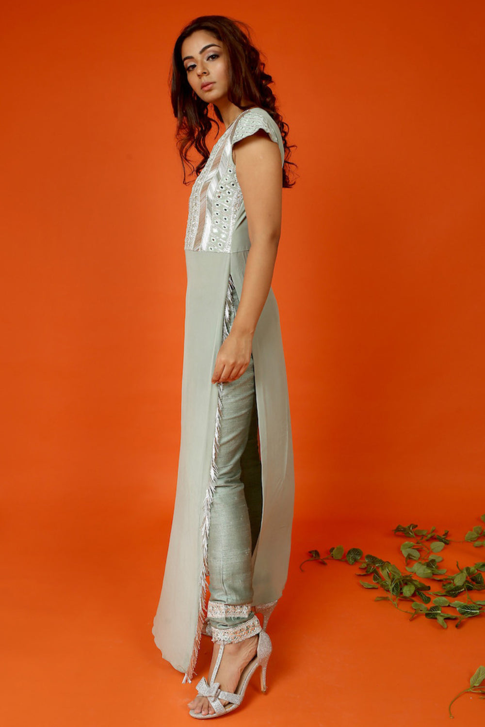 Featuring here is a sage green mirror work long kurta with high slit and tassels details on one side. This is paired with raw silk pants.