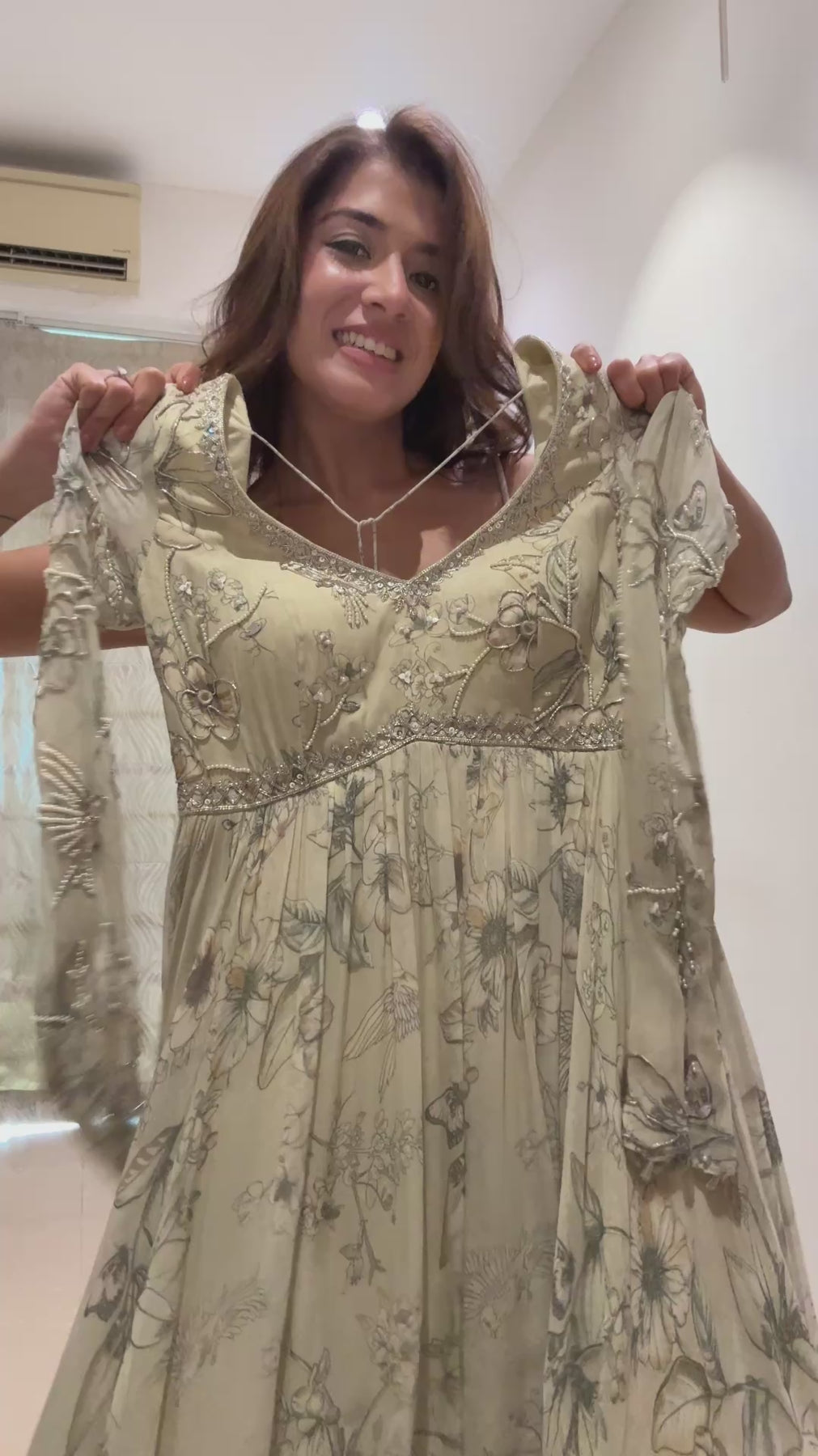 Featuring Sukhmani Gambhir in our ivory printed anarkali with hand embroidery on the yoke and cancan for added flair. It is paired with a beautifully embroidered organza dupatta.