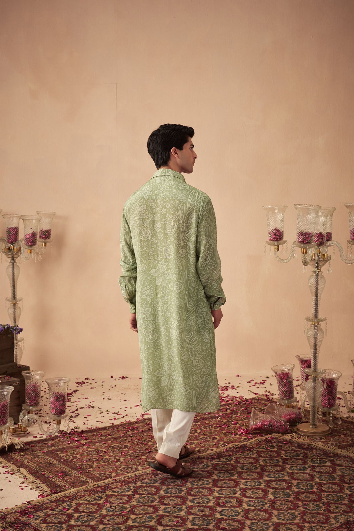 Featuring a sage green printed kurta paired with white pants.