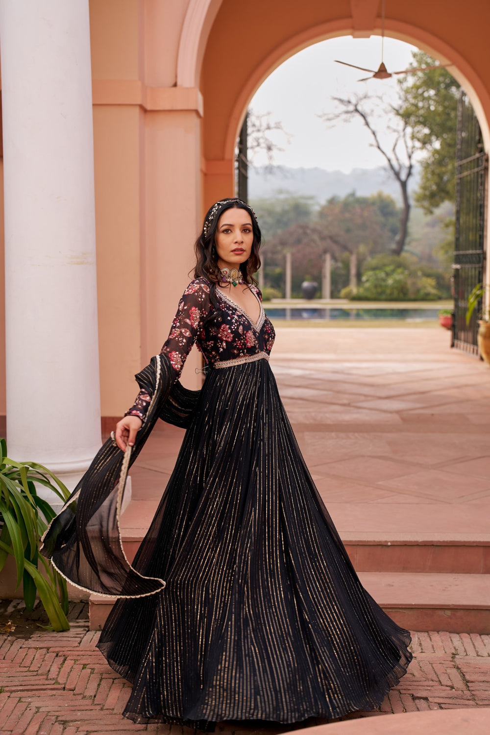 Featuring here a black full sleeves anarkali with hand embroidered work on the yoke and black lurex georgette flair with cancan