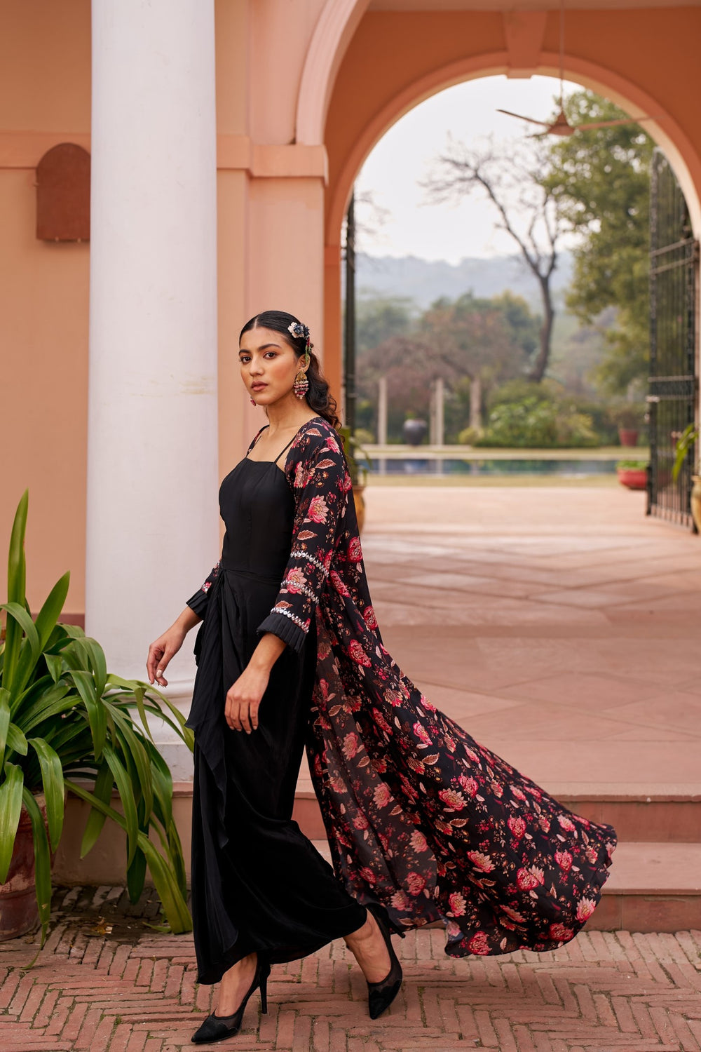Featuring here a black draped dress in crepe base. It is paired with a matching printed jacket with embroidery. on the sleeve