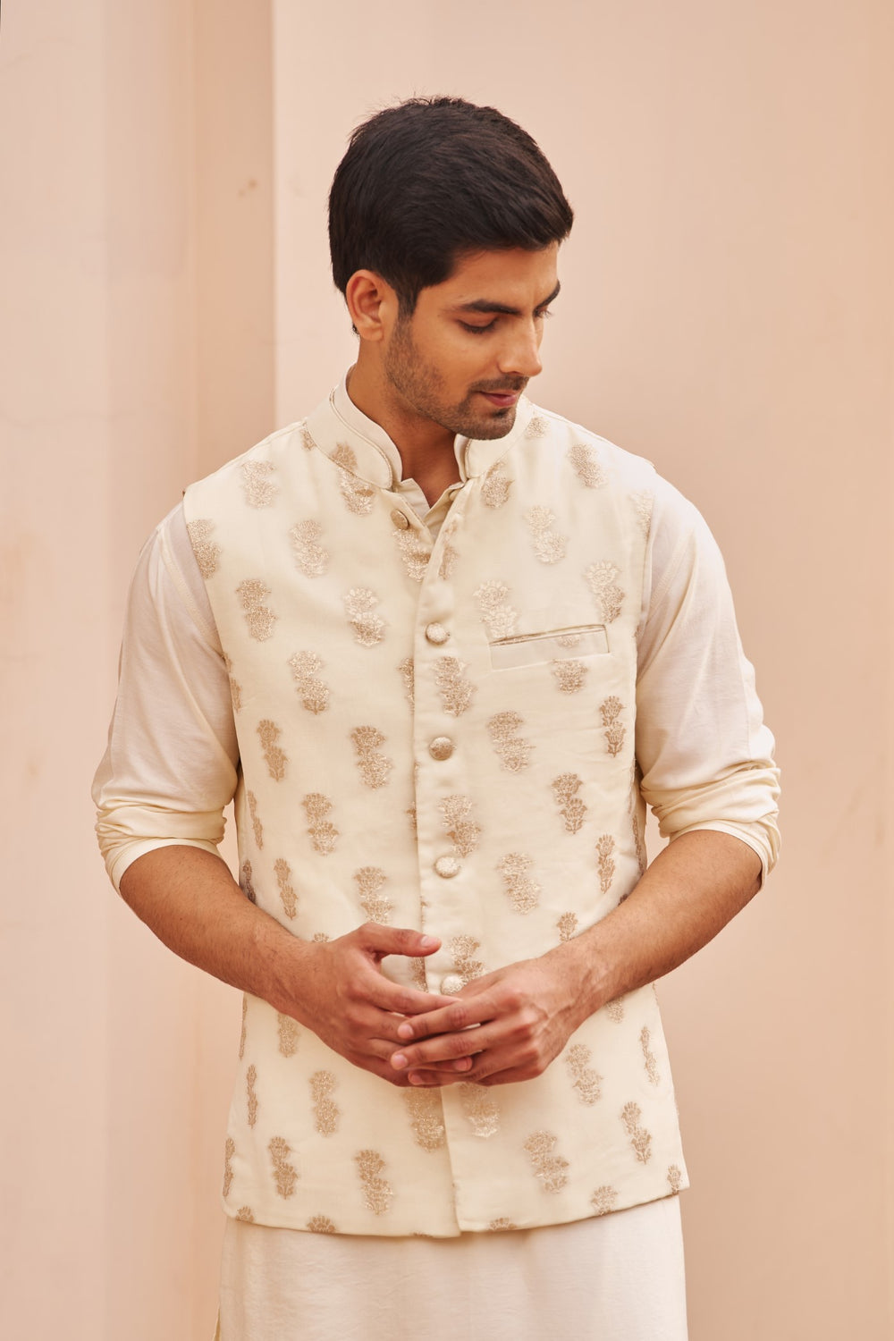 Featuring Here a ivory chinese collar kurta with pants. This set comes with a banarasi bundi jacket