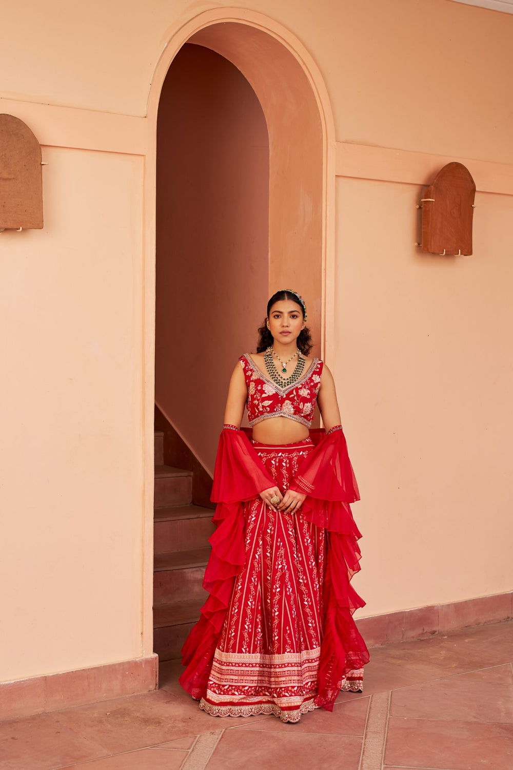 Featuring a red printed lehenga skirt with cancan. This set has a sleeveless embroidered blouse and red organza dupatta with sequin work.