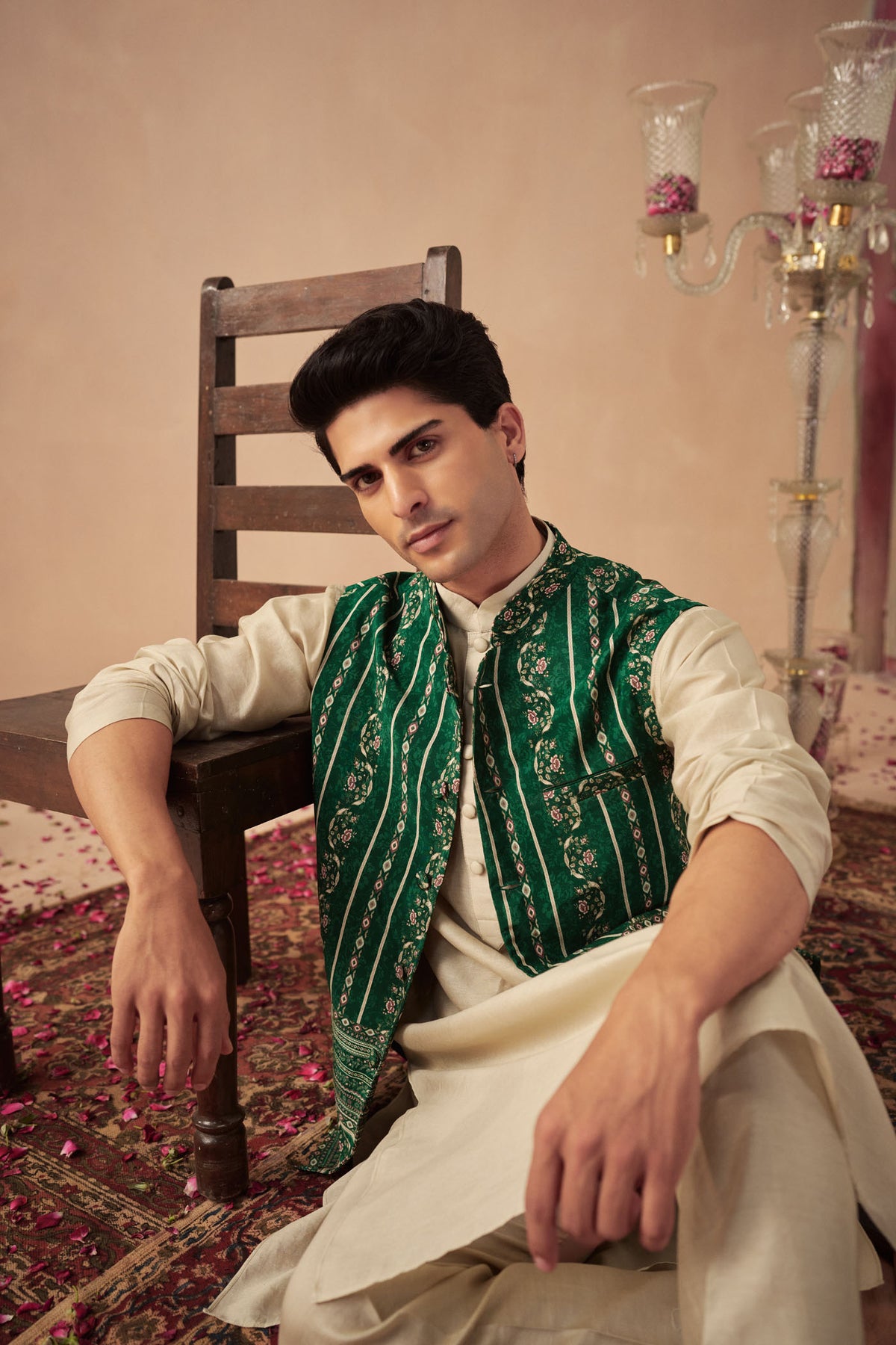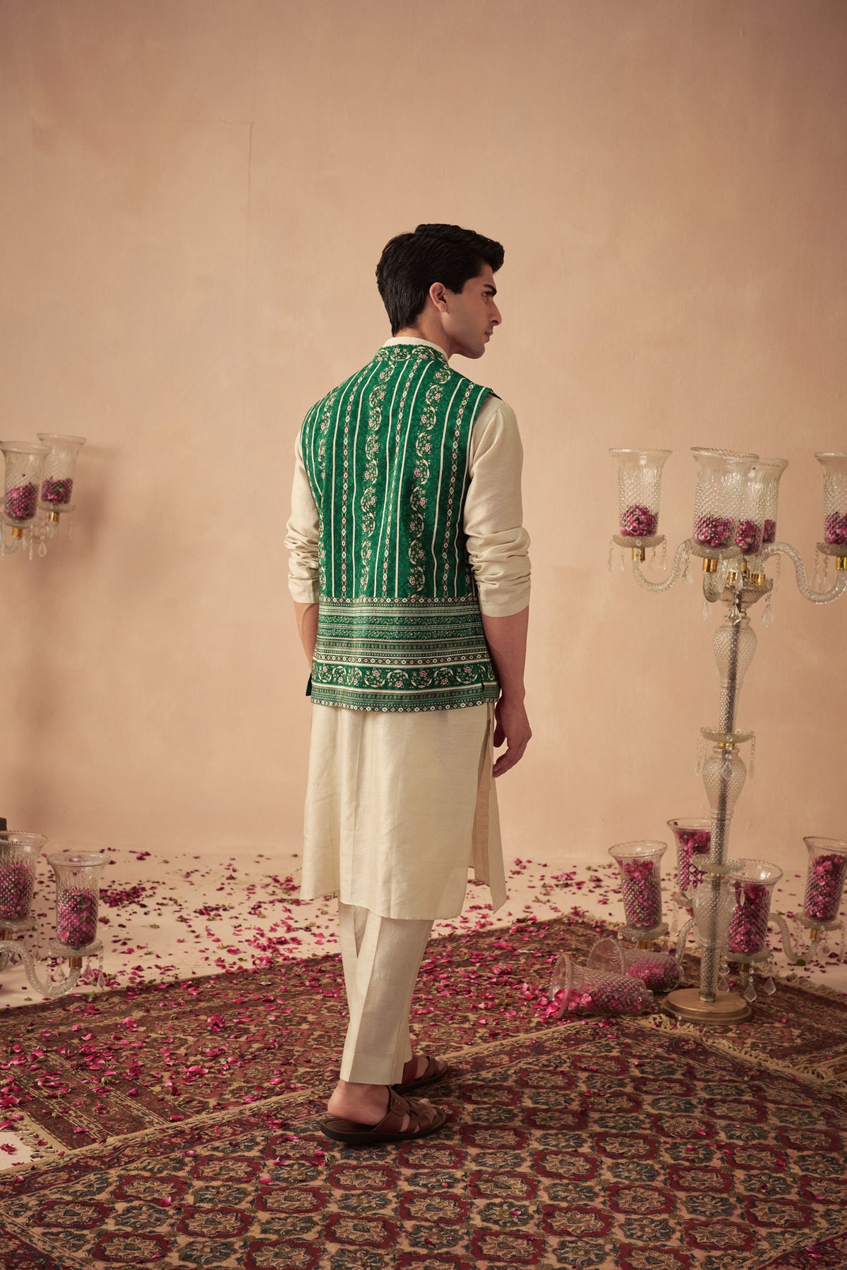 Featuring a green printed bundi paired with a beige kurta and pants.