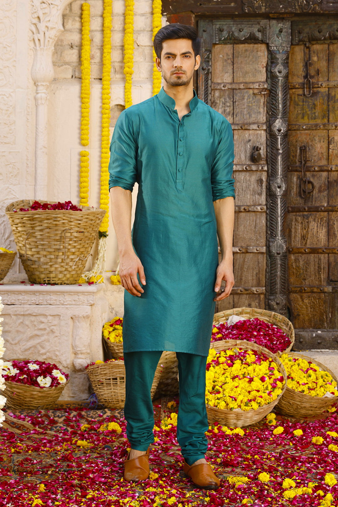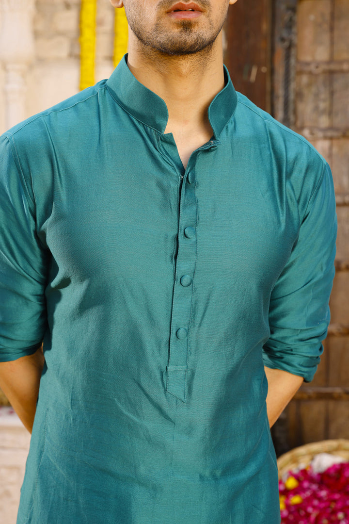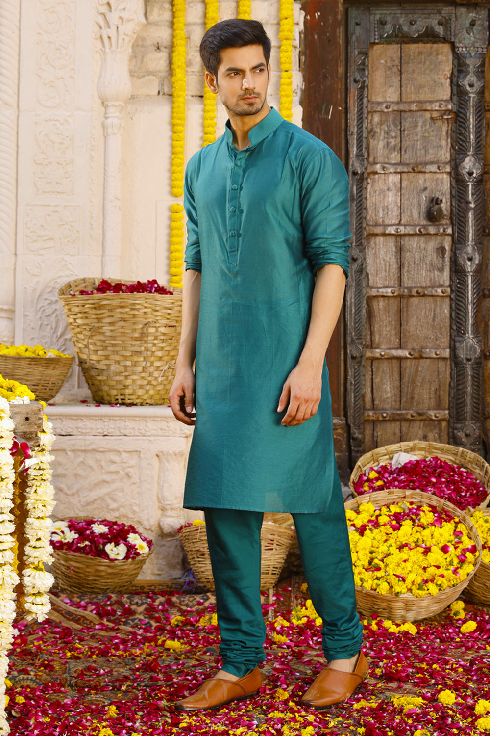 Featuring a bottle green knee length kurta with chinese collar. It comes with a bottle green pants.