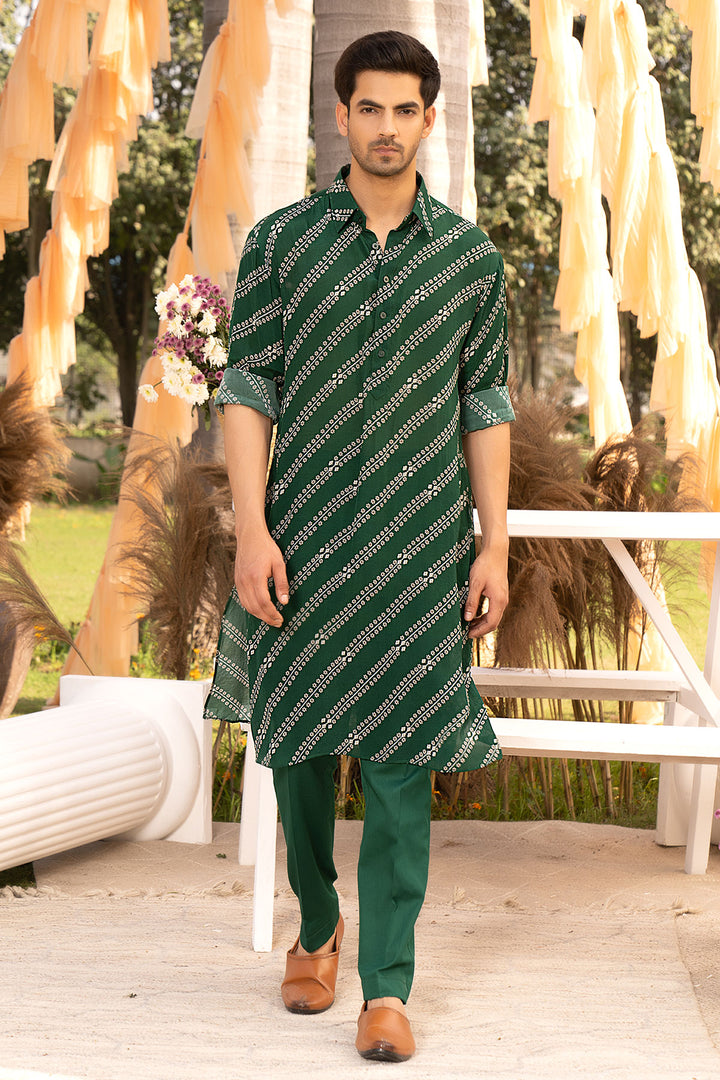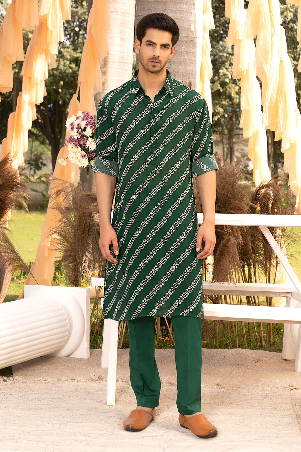 Featuring A green stripe printed kurta. It is paired with a green solid pant