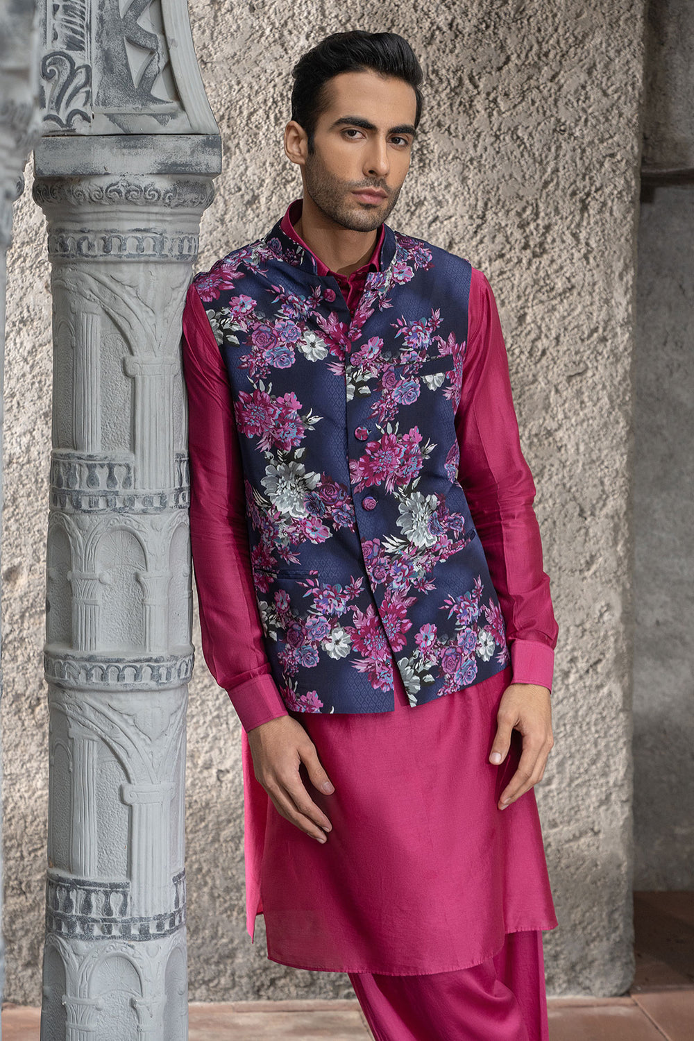 Featuring a burgundi pathani kurta in chanderi base. It is paired with matching salwar and navy blue printed bundi