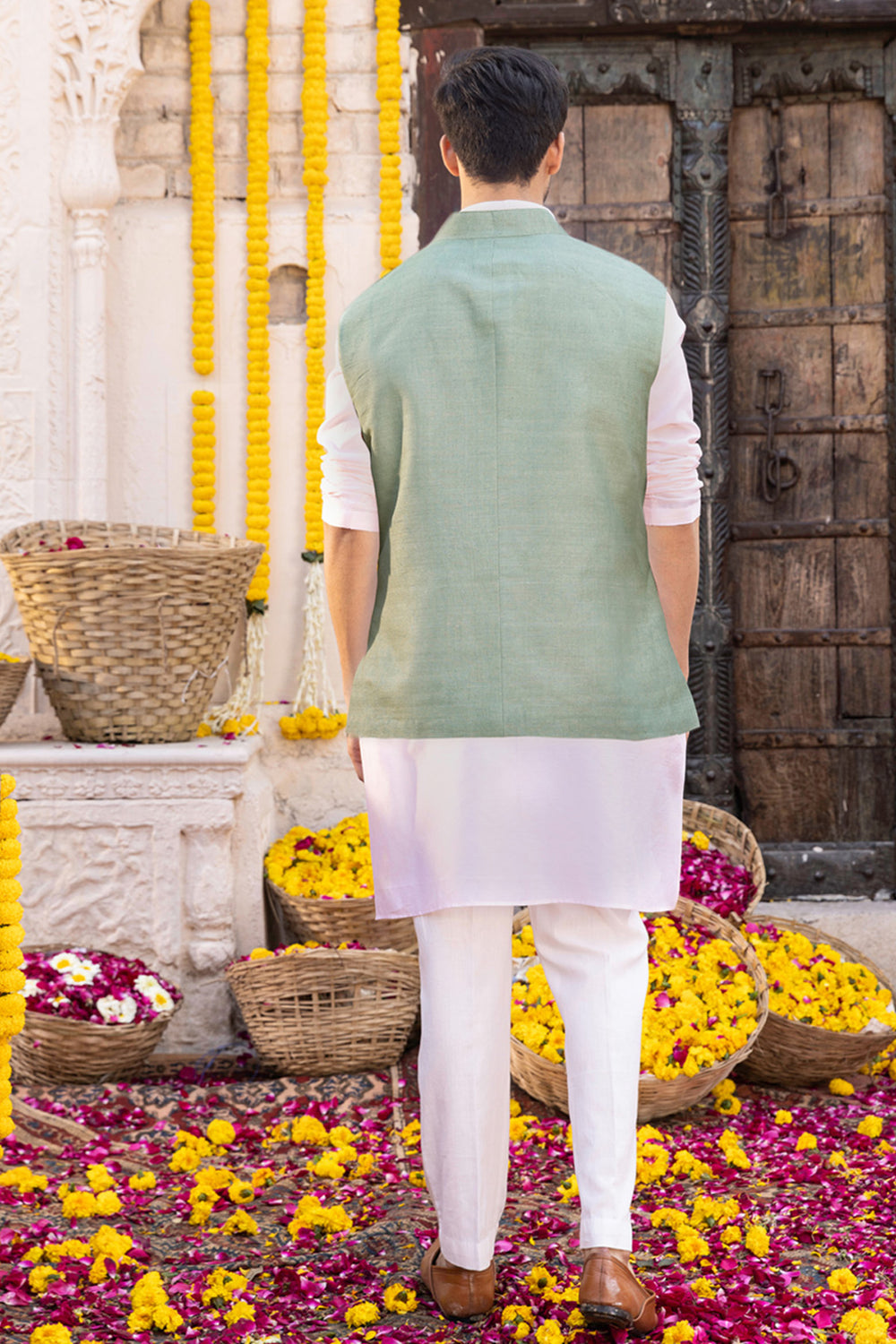 Featuring a light peach kurta set with white pants. This set is paired with a sage green jacket