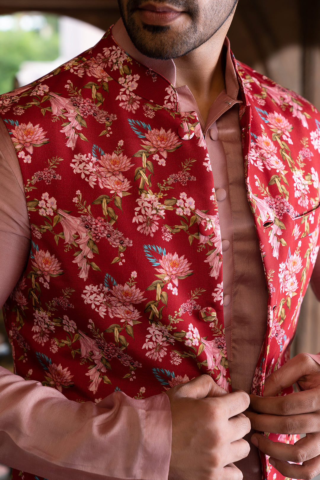 Featuring Here A Onion pink chinese collar kurta with onion pink churidaar. This set has a maroon floral printed bundi.
