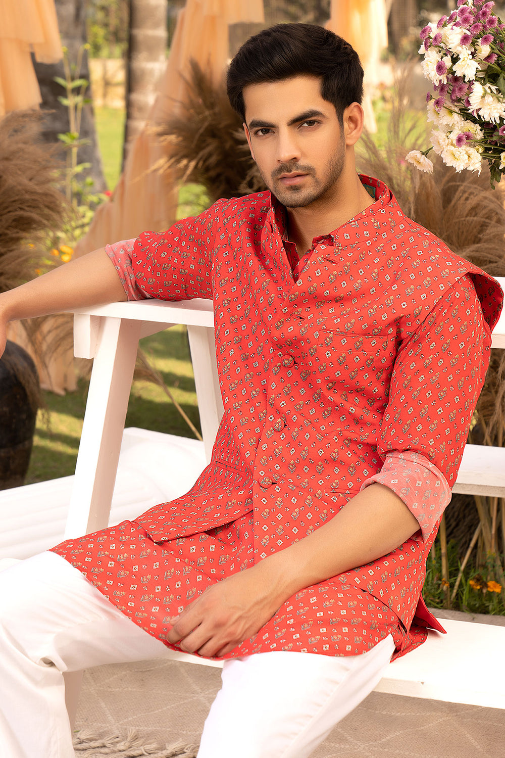 Featuring A red bootie printed kurta with pants. This set comes with a red bundi