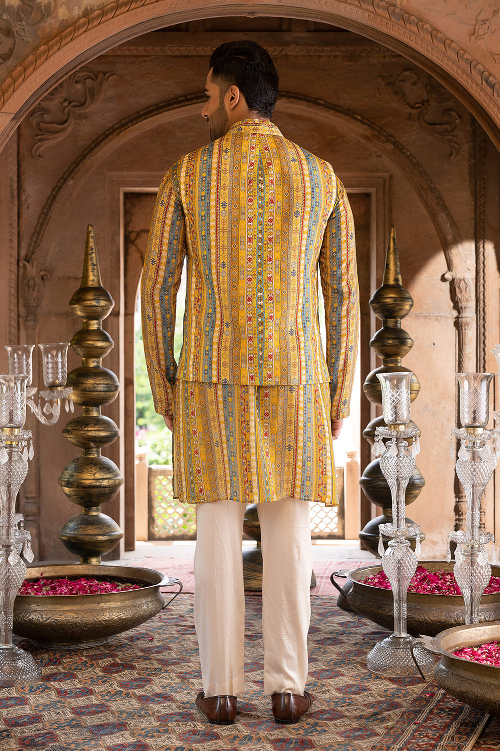 Featuring Here a yellow printed short length kurta with a beige Colored pants. This set has a yellow border printed bundi.