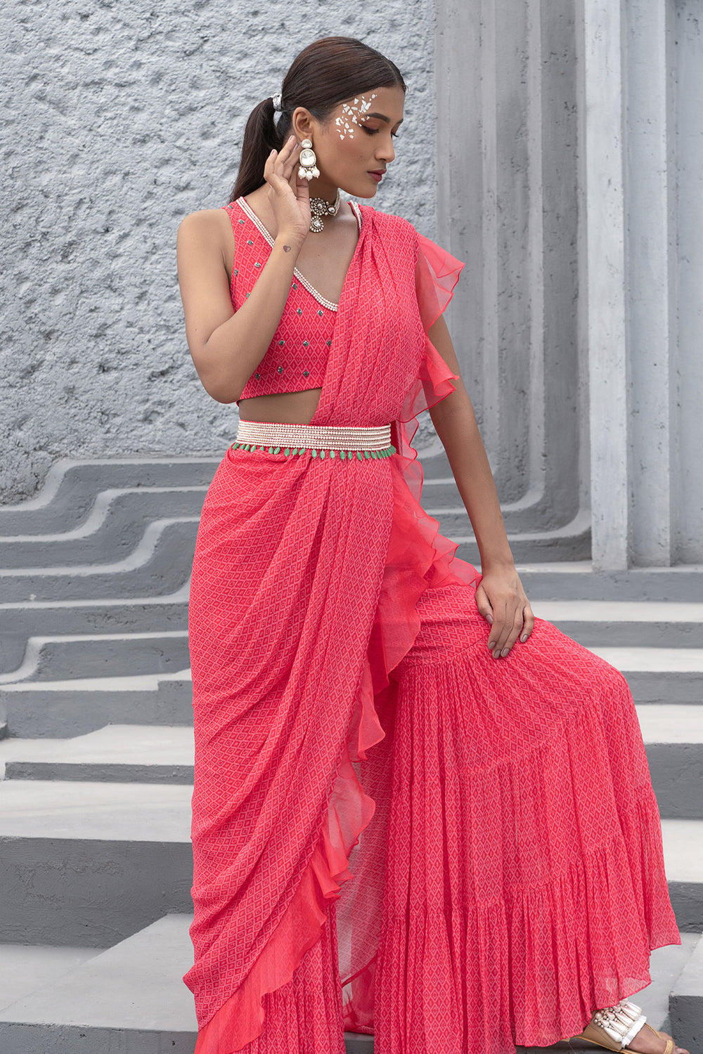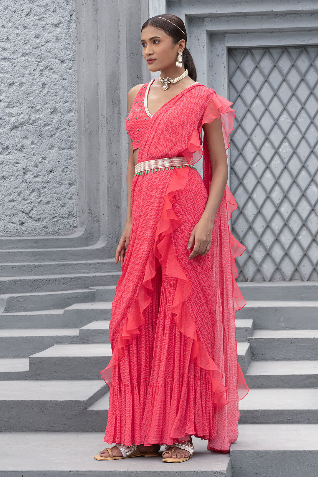 Featuring a raspberry pink printed sharara saree in georgette base. It is paired with a matching hand embroidered blouse and a belt.