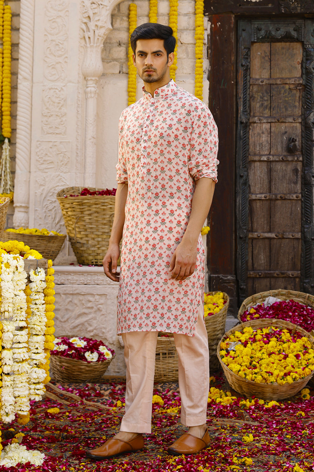 Featuring a light peach printed knee length kurta. It is paired with a light peach pants.