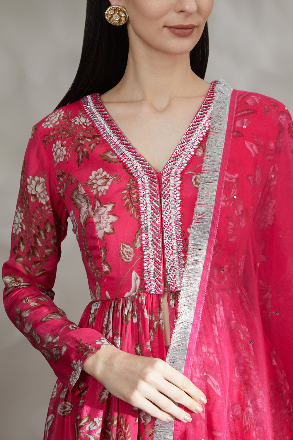 Featuring here hot pink printed sharara with printed front open kurta. The neckline has silver embroidery and paired with an organza dupatta.