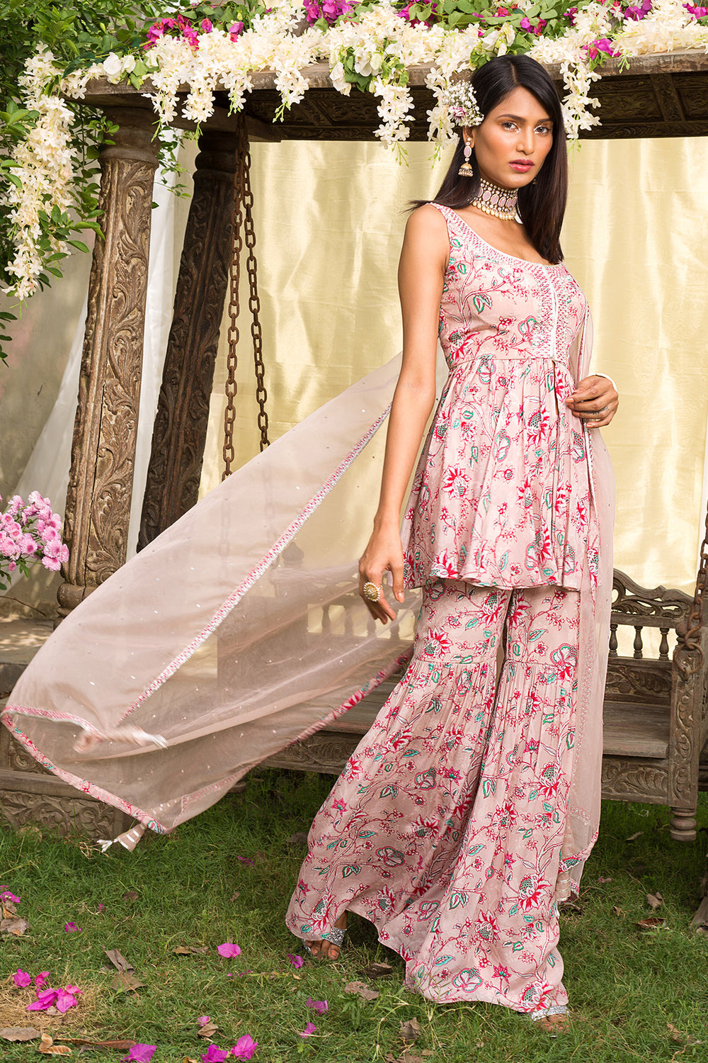 Featuring here light pink printed sharara with printed front open short kurta. The neckline has silver hand embroidery and is paired with light pink organza dupatta.
