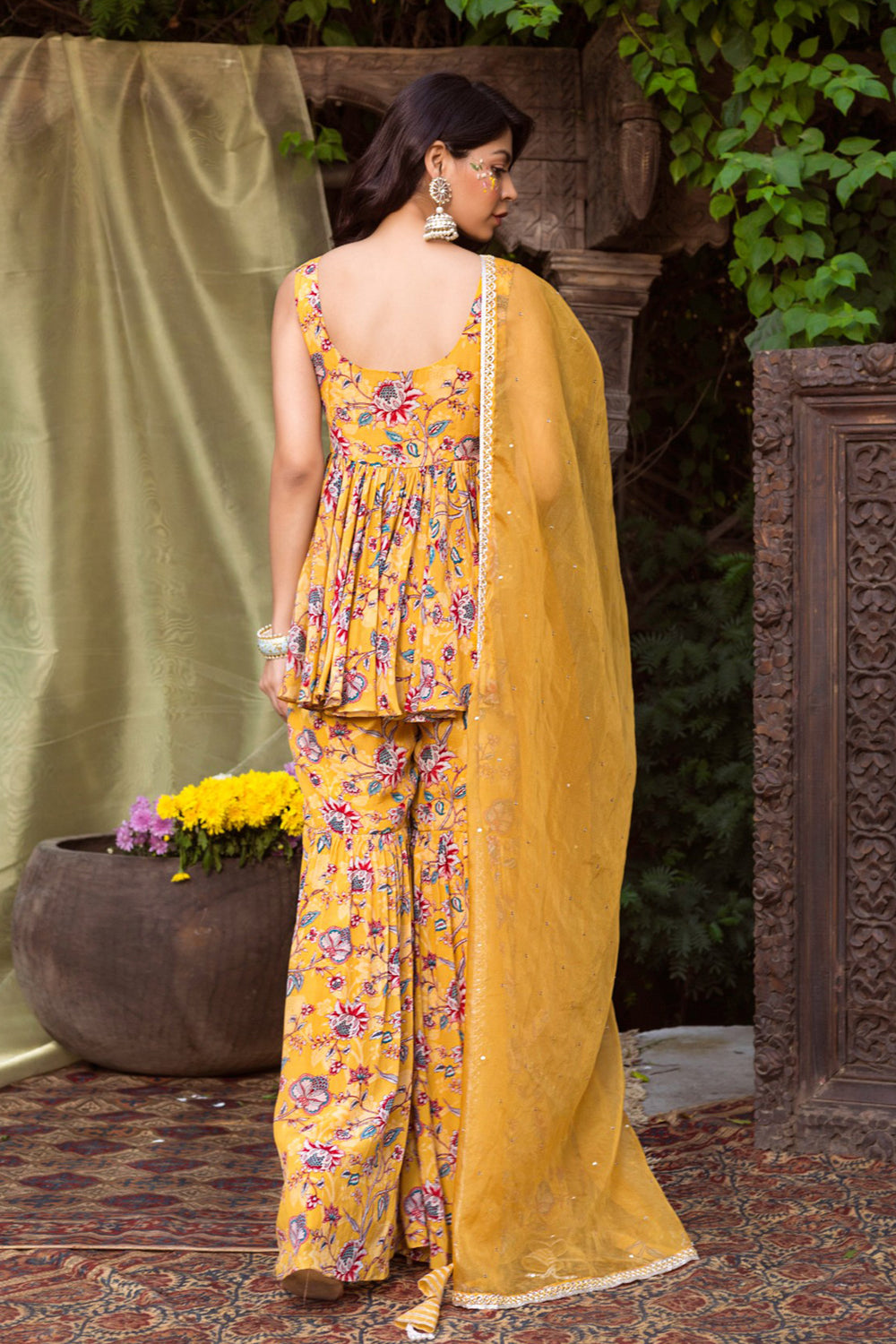Featuring here yellow printed sharara with yellow printed jacket style kurta on top. This comes with a hand embroidered yellow organza dupatta