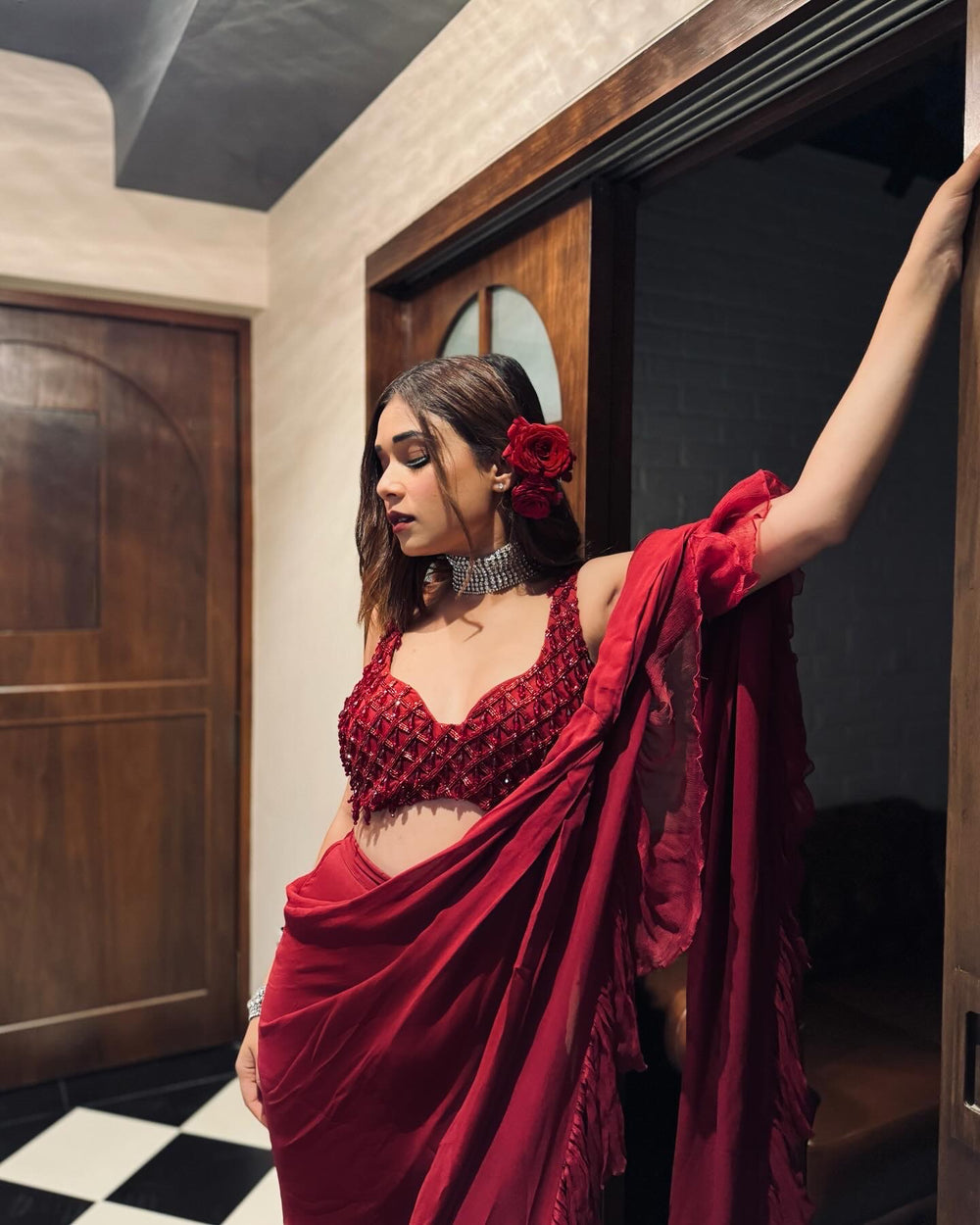 Featuring here a maroon sharara saree with an embroidered sleeveless blouse.