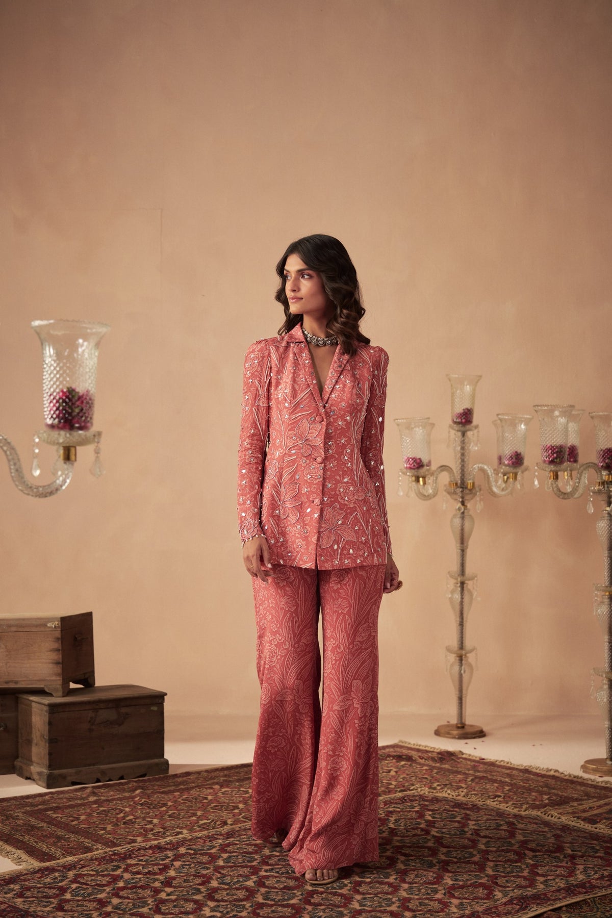 Featuring a coral printed, hand-embroidered jacket with bell bottoms.